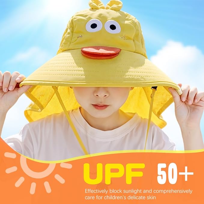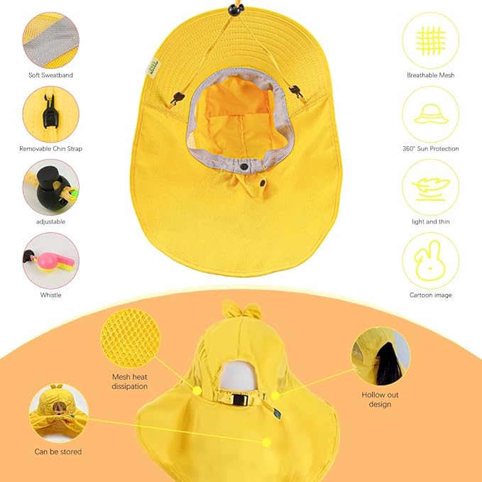 Wide Brim Sun Hat for Kids Girls with Neck Flap Shawl Whistle, UPF 50+ Adjustable Chin Strap Sun Protection Hat for Girls 5-10 Years Old, Summer Breathable Sun Visor Hat Windproof Hat | Random Color