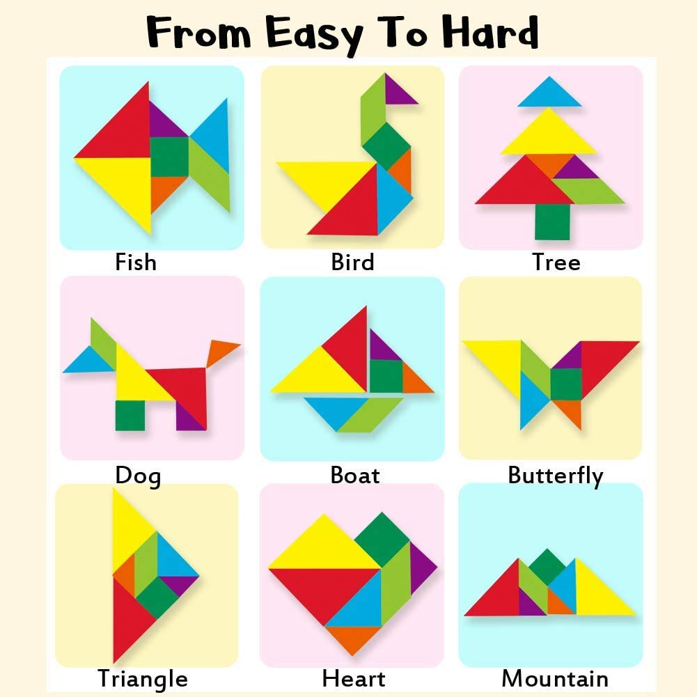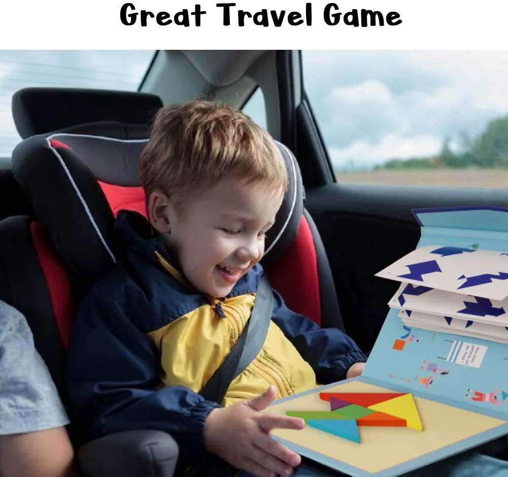 Wooden Tangram Travel Game Magnetic Puzzle Book Game Tangrams Jigsaw Shapes with Solution Traveler Challenge IQ Educational Toy for 3-99 Years